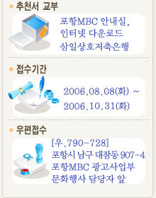 -. 포항시 남구 대잠동 907-4 포항MBC 광고사업부 문화대상 담당자앞 |