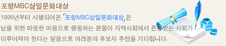 ○수상자 후보자격 - 포항MBC 관할지역내 5년이상 거주(창립)한 개인이나 단체며, 한국인과 외국인, 특히 외국인 중 한국인을 대상으로 봉사활동을 하는 개인 및 단체도 포함. |