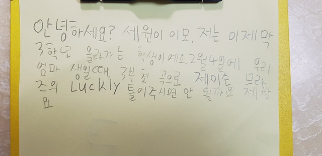 아래 사진이 저희 아들이 직접 작성한 메세지인데요. 낯간지러운 말좀 쓰라니깐 부끄러워서 절대 안쓰겠다네요 ㅡㅡ;