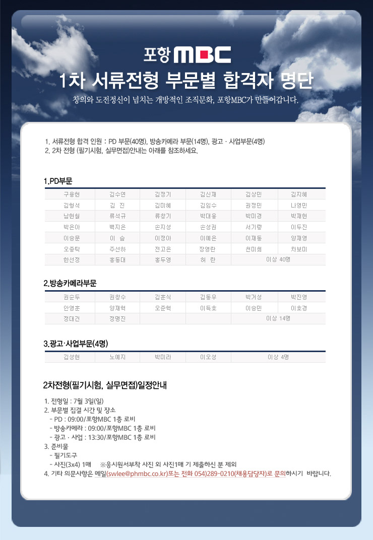 포항 MBC 인턴사원 부문별 1차전형 합격자 발표